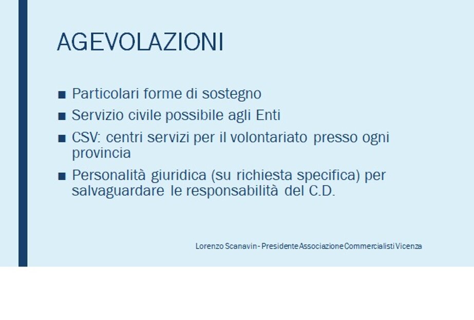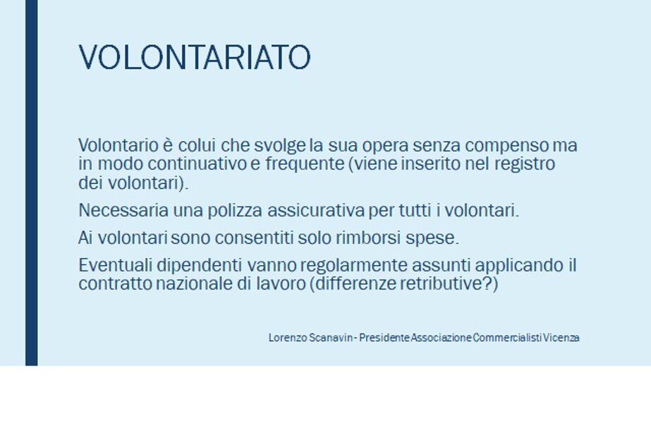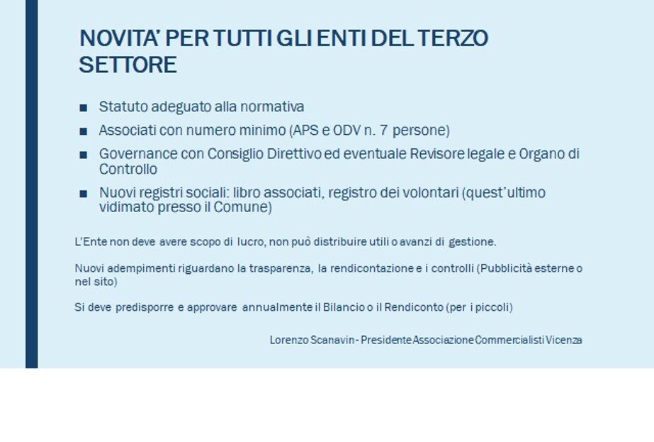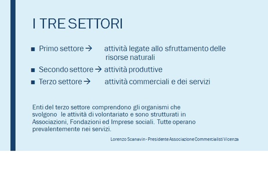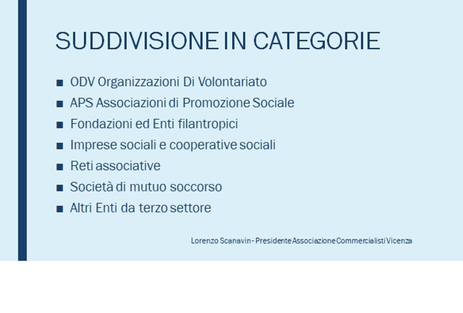 Codice del terzo settore (dlgs 117/2017): “Sono enti del Terzo settore le organizzazioni di volontariato, le associazioni di promozione sociale, gli enti filantropici, le imprese sociali, incluse le cooperative sociali, le reti associative, le società di mutuo soccorso, le associazioni, riconosciute o non riconosciute, le fondazioni e gli altri enti di carattere privato diversi dalle società costituiti per il perseguimento, senza scopo di lucro, di finalità civiche, solidaristiche e di utilità sociale mediante lo svolgimento, in via esclusiva o principale, di una o più attività di interesse generale in forma di azione volontaria o di erogazione gratuita di denaro, beni o servizi, o di mutualità o di produzione o scambio di beni o servizi, ed iscritti nel registro unico nazionale del Terzo settore”.